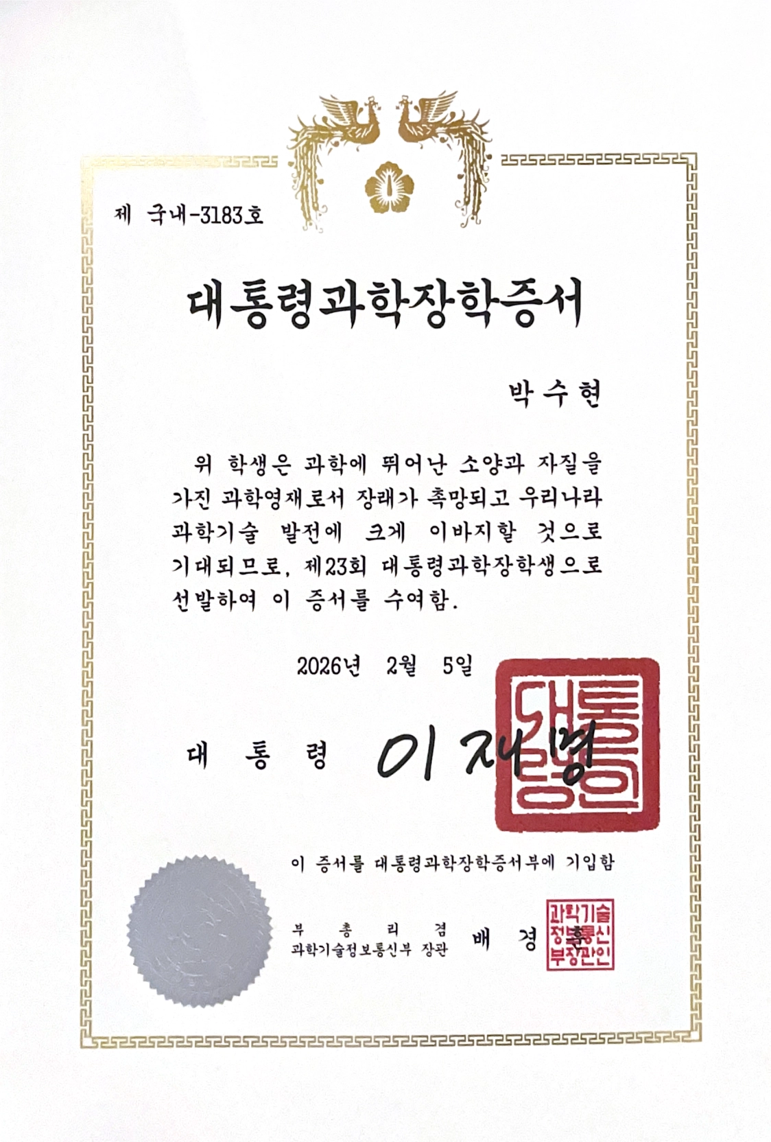 We are thrilled to announce that Suhyun Park has been selected as one of only 50 recipients nationwide for the prestigious Graduate School Presidential Science Scholarship!