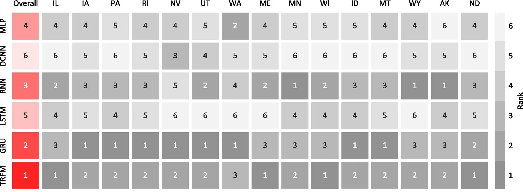Matrix plot summarizing the performance rank of six deep learning architectures