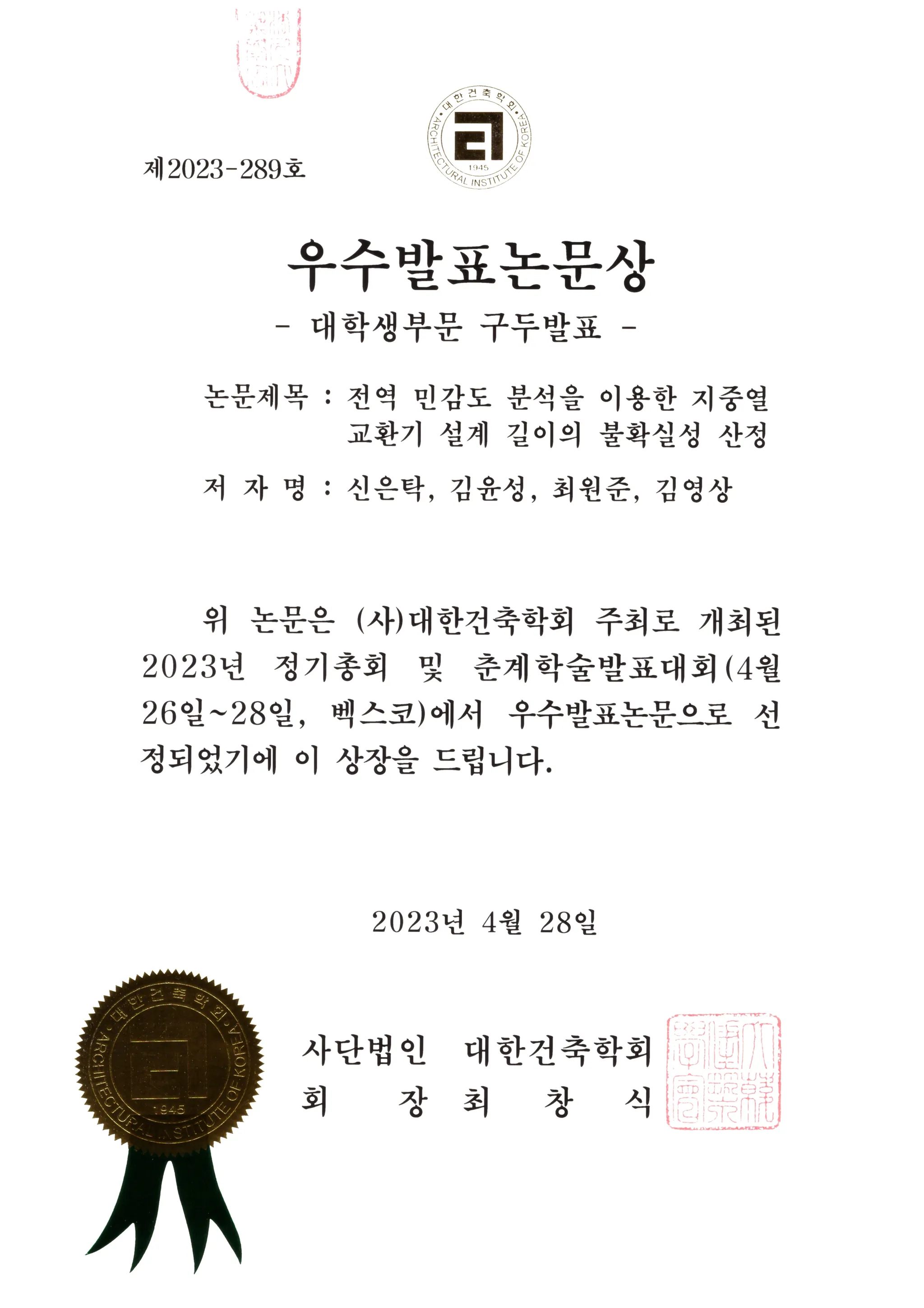 The betlab's two conference papers, presented at the 2023 Spring Conference of Architectural Institute of Korea (2023 AIK Spring Conference ), received the excellent presentation conference paper award.