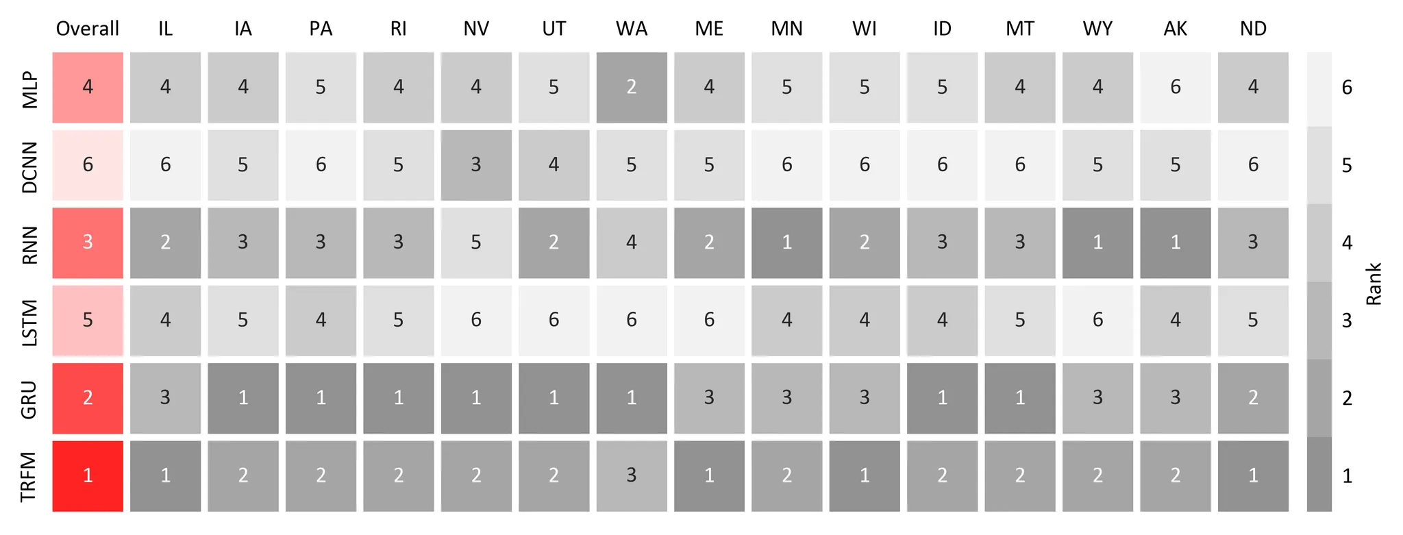Rank of six deep learning architectures for regions belonging to different climate zones